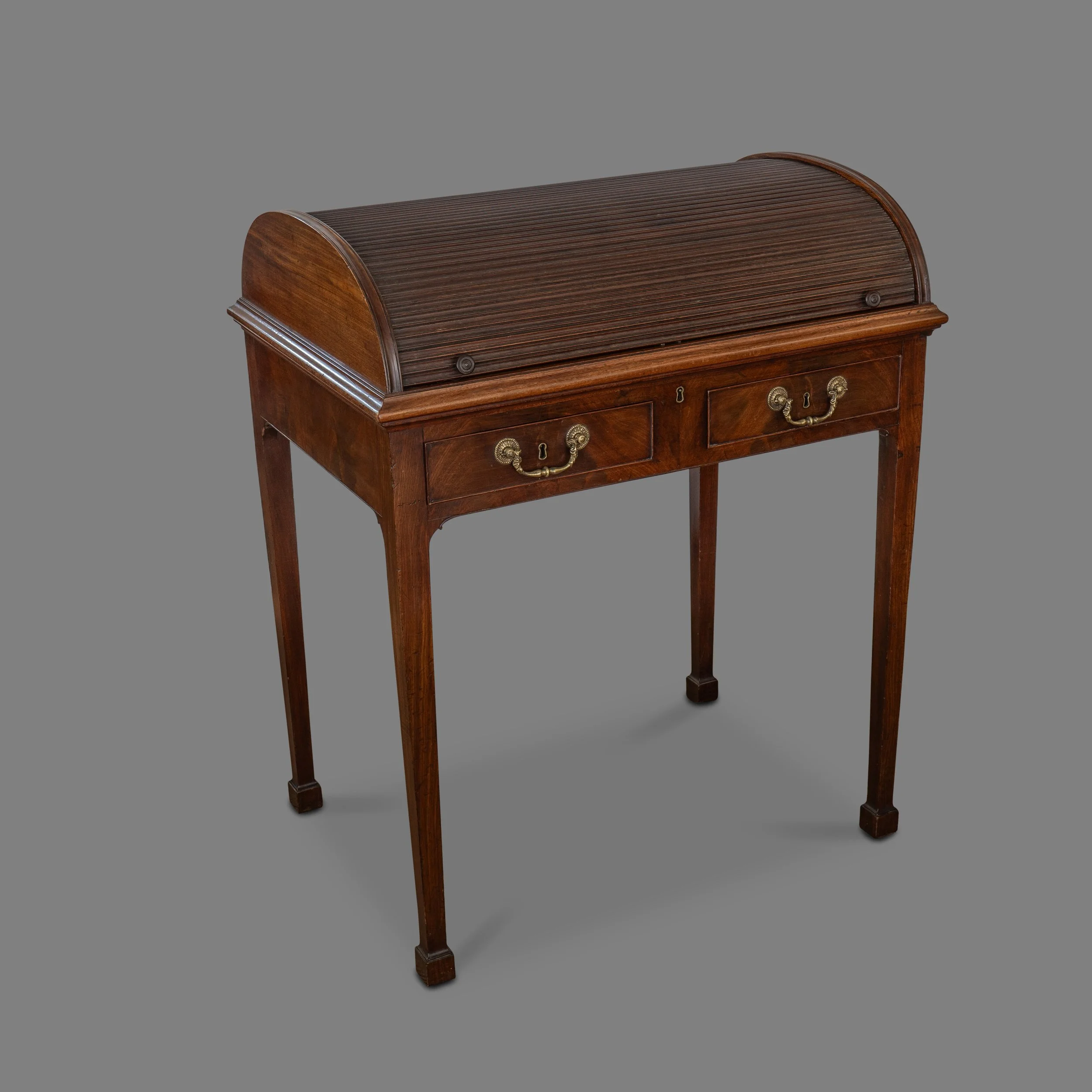 A fine small George III mahogany Chippendale writing desk with two full length drawers and with original gilt brass handles on tapered legs with delicate carved spandrels on raised black feet. Circa 1780
