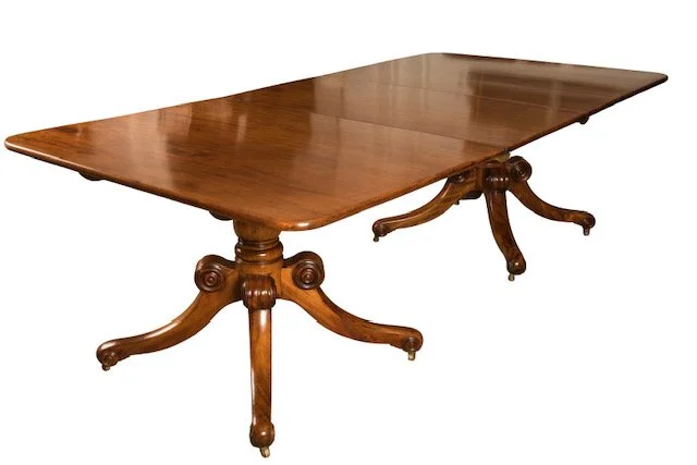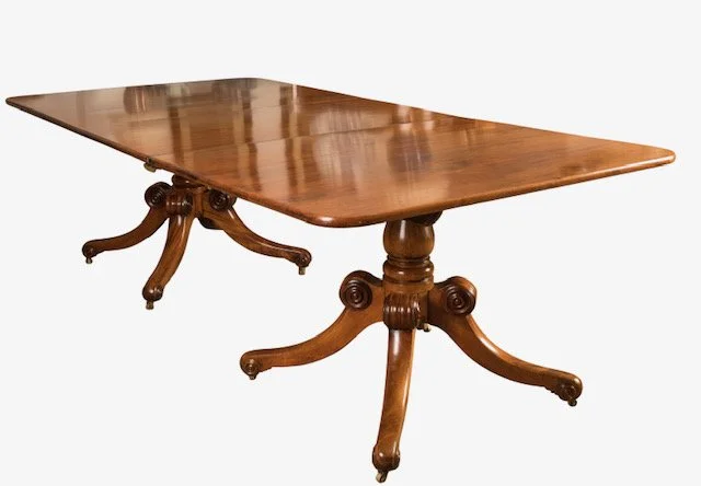 A good George III mahogany dining table with original leaves on turned pedestal base. Circa 1820
