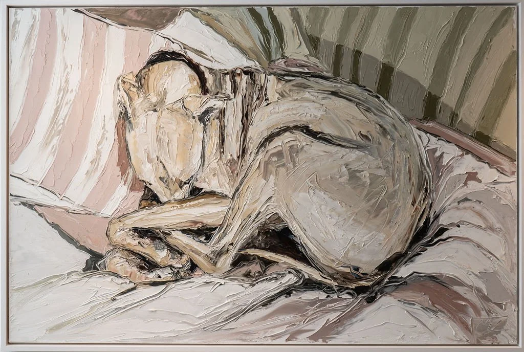 Slide 1 Slide 1 (current slide) still life of a whippetmixed media on canvas by Max Leuchars155cm wide 105cm Height £3,750 Contact Us